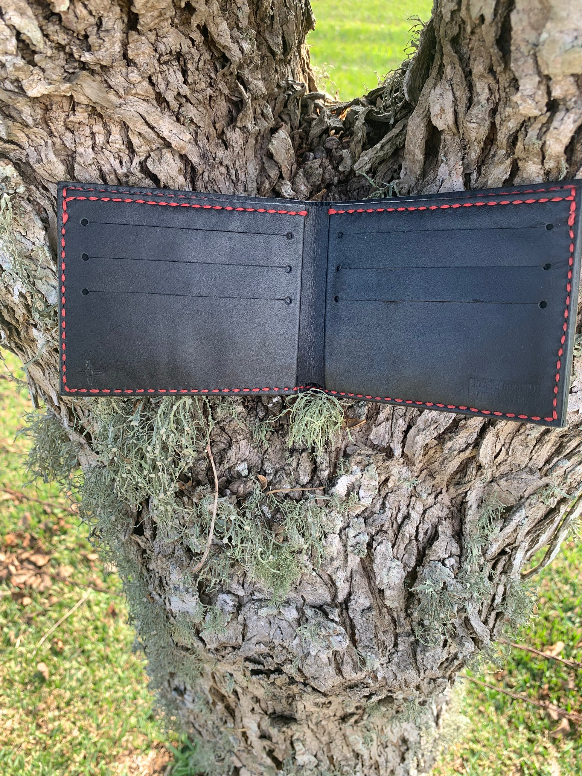 Hand-marbled leather billfold. Featuring (6) card pockets, two hidden pockets, and a cash pocket. 100% handcrafted and hand sewn .